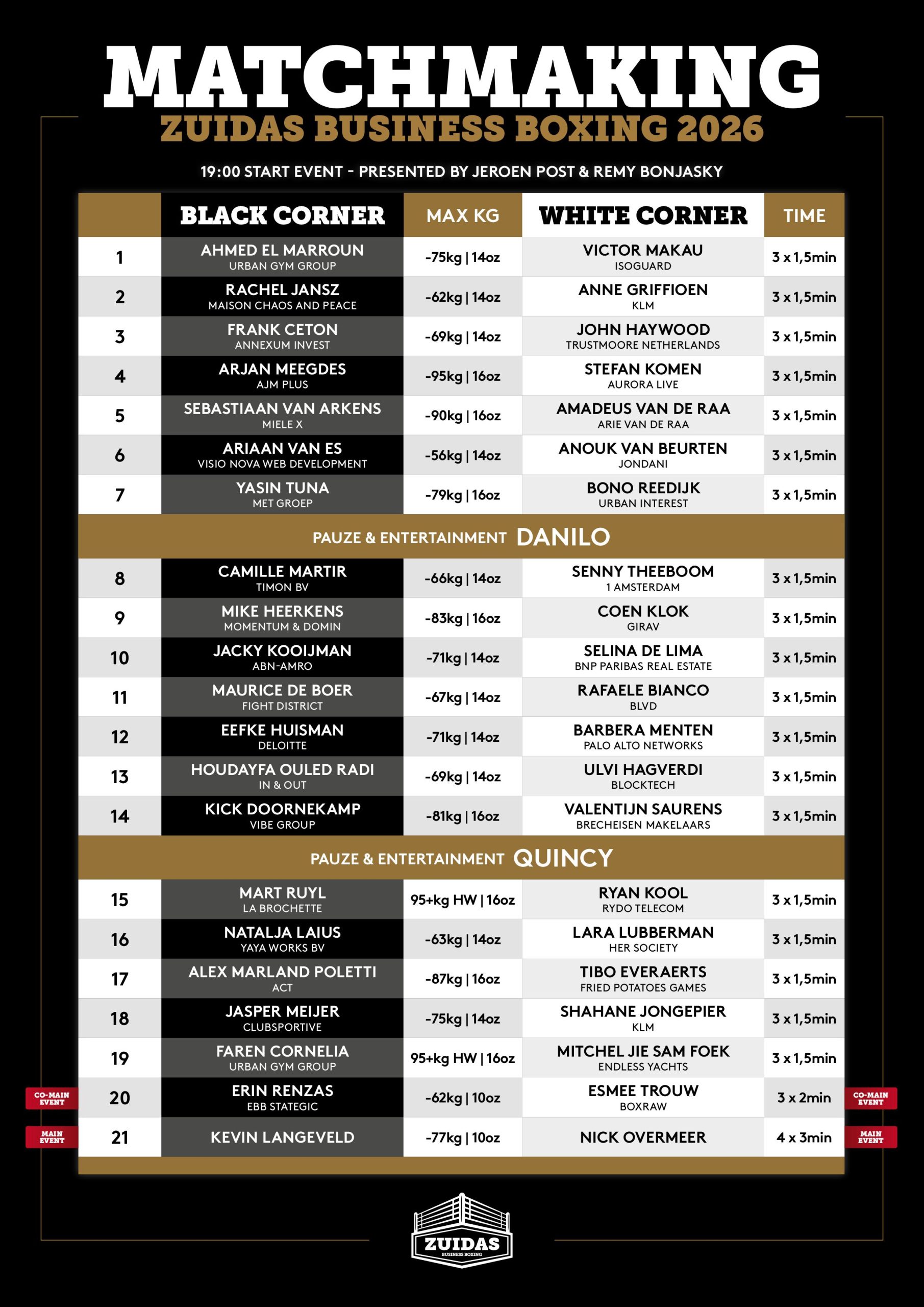 De matchmaking is bekend! Het is bijna zover zaterdag 9 mei 2026 vormen de magische Sporthallen Zuid in Amsterdam het decor voor een bijzonder en zeer exclusief boksgala.